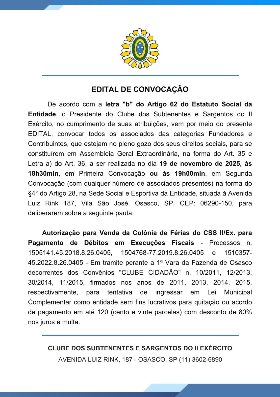 Fique por dentro. Divulgação dos editais do Clube dos Subtenentes e Sargentos do II Exército